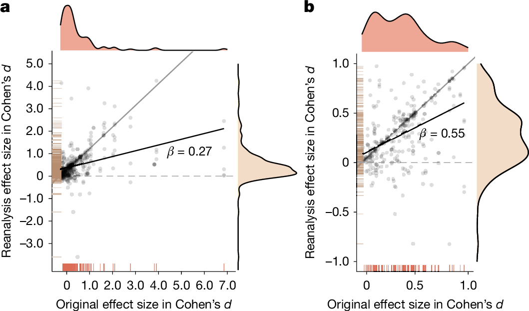 Rreanalysis data trimmed at Cohen’s d ≤ 5 and d ≤ 1, respectively, indicates that reanalysis effect sizes show a tendency to be smaller than the original effect sizes, as reflected in their best-fitting (least-squares) line. The distribution of original and reanalysis effect sizes also supports this, because the peak of the density distribution of the latter is markedly lower. The original results showed a mean effect size of 0.73 (median = 0.43), whereas the reanalysis yielded a mean effect size of 0.49 (median = 0.35), with Cohen’s d calculated for d values ≤ 5. This result is consistent with the possibility that the original authors were biased towards reporting larger effects than the reanalysts, that the reanalysts were biased towards reporting smaller effects than the original analysts, or both.