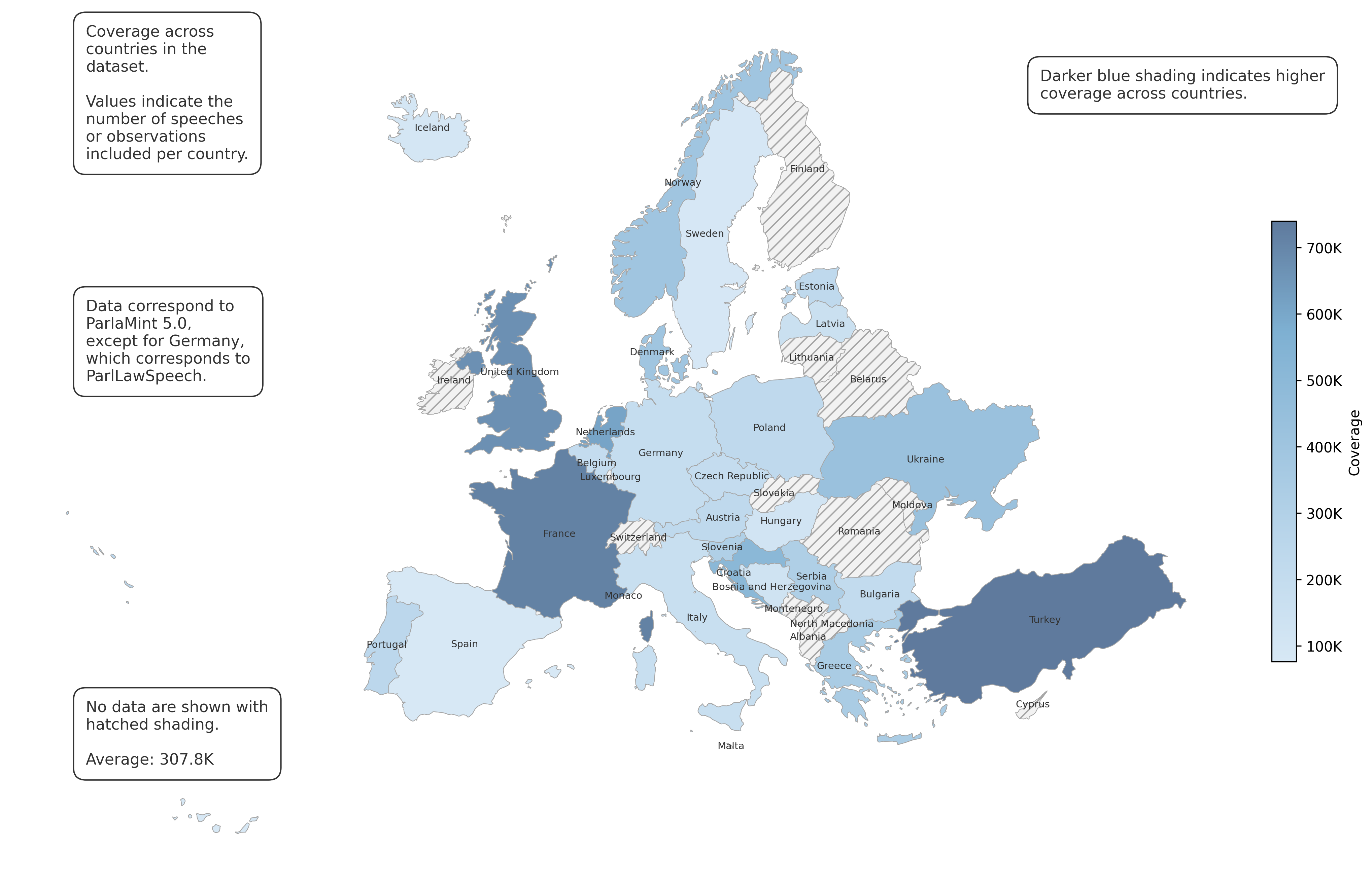 A central descriptive result is the project’s broad cross-national data coverage, with an average of more than 307,000 speeches per case.